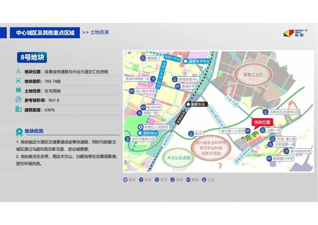 其中面积最大的地块是8号地块,位于成青金快速路与兴业大道交汇处西侧,总面积165.74亩,容积率1.8,为住宅用地,周边有木兰山、白鹤岛等生态景观,居住环境颇佳。