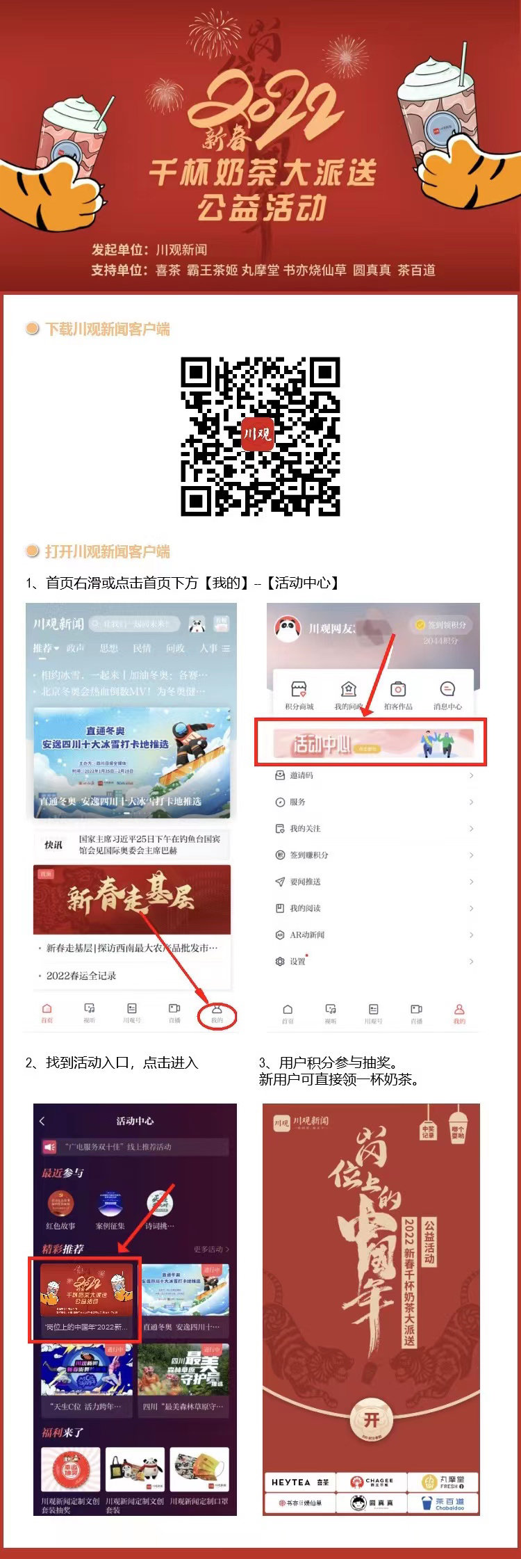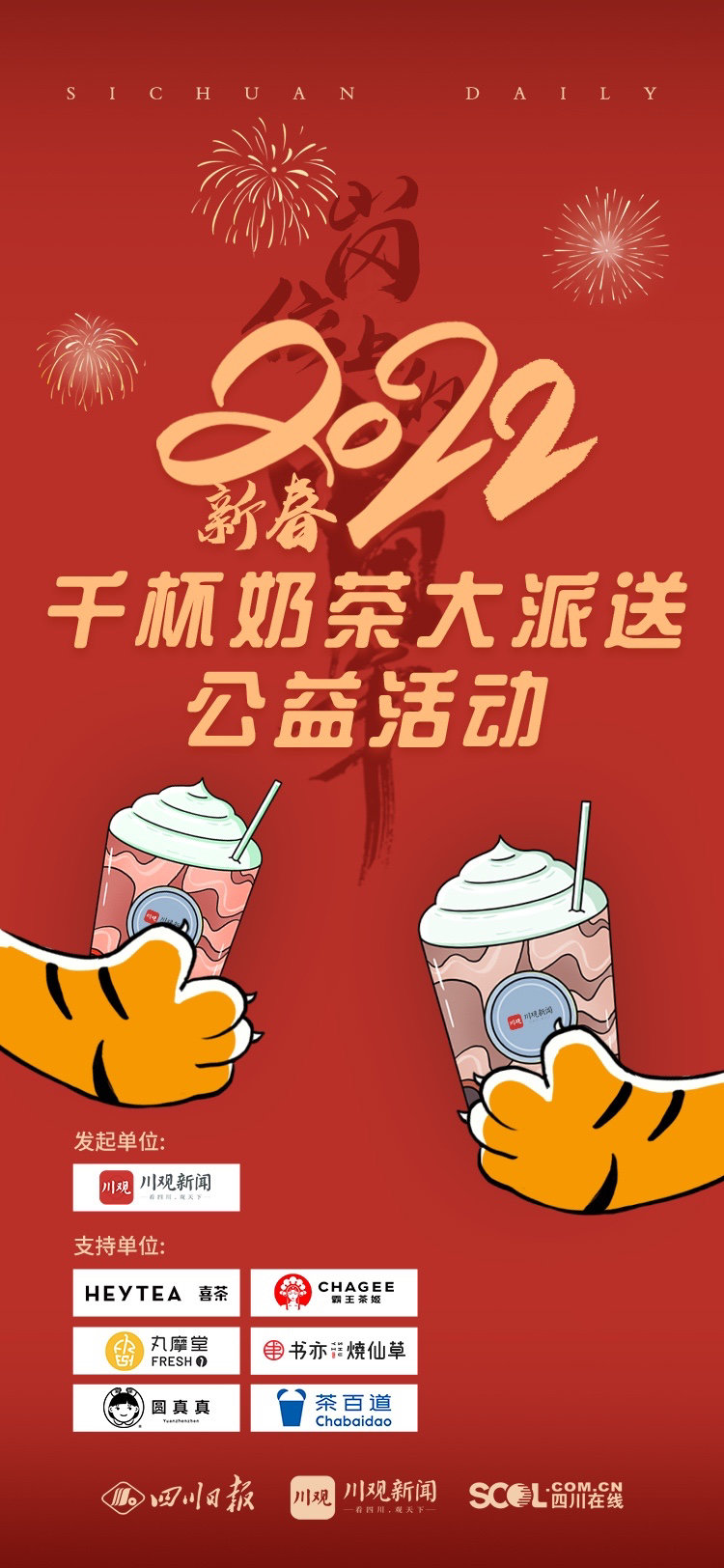 千杯奶茶,新春情暖“在岗人”。农历虎年春节将至,四川在线携手喜茶、奈雪的茶、丸摩堂、书亦烧仙草、圆真真以及茶百道,发起“岗位上的中国年”系列活动之“千杯奶茶大派送公益活动”,为岗位上奋斗的可爱人们送上新春的第一杯奶茶,说出一句温暖“呵‘虎’”的新年祝福。