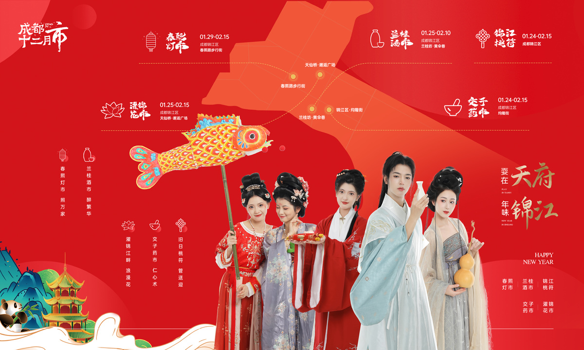 虎年春节临近,在持续抓好疫情防控各项工作的前提下,成都市锦江区政府及相关企业从弘扬中国优秀传统文化、构建国际化创新消费体验维度出发,倾力打造“耍在成都,年味锦江”系列活动,其中“十二月市之灯市、酒市、花市、药市、桃符市”五大创意文化市集活动将在锦江畔盛装启幕,带来丰富多元的文化体验和充满年味的创新消费场景,让归乡的游子、留蓉的市民、各地的游客在成都共度一个幸福美好、年味浓浓的虎年新春佳节。
