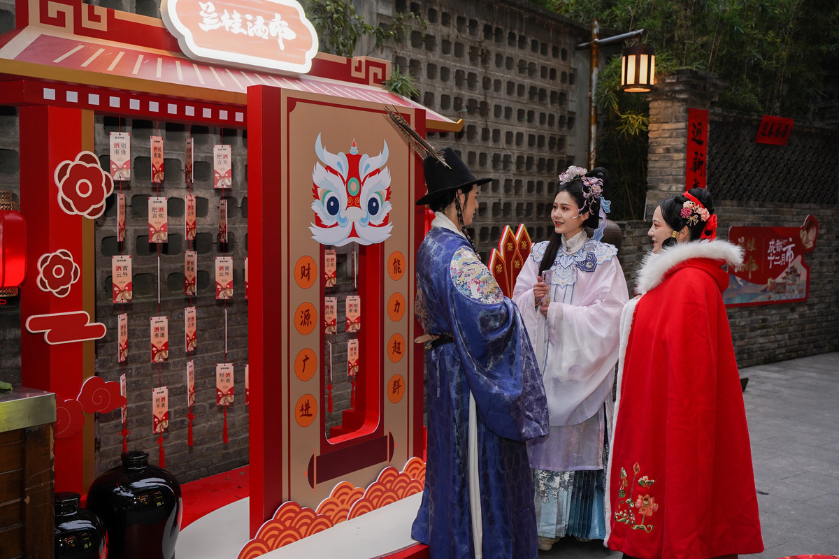 当悠悠古街与浓浓年味完美融合,既能触摸到历史,感受天府酒文化的源远流长;又能赏心悦目,在虎年新春的创意造景中感受无限温情。兰桂酒市跨界整合行业优质资源携手百威啤酒和水井坊,古今联动,打造“古风酒肆沉浸体验”,让人一秒穿越回北宋赵抃笔下《成都古今集记》中记载的“沿途设肆,贩酒品酒,宾客往来,饮酒赋诗”的诗意画卷中。