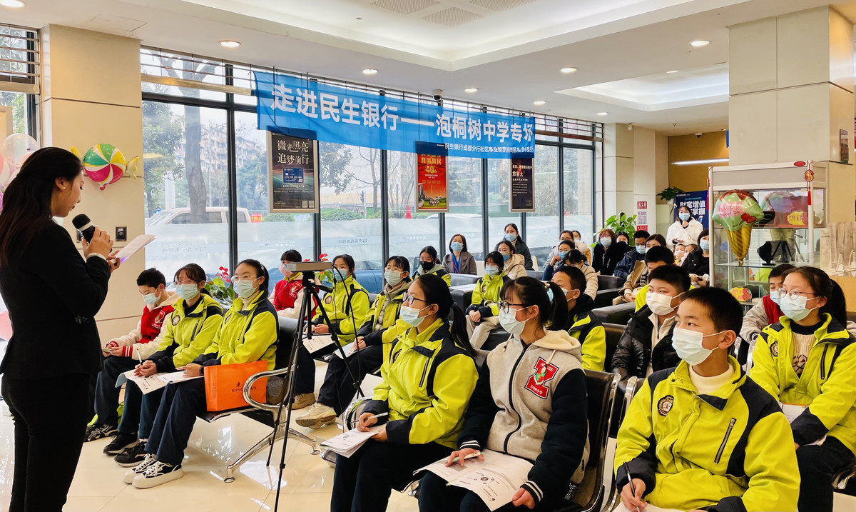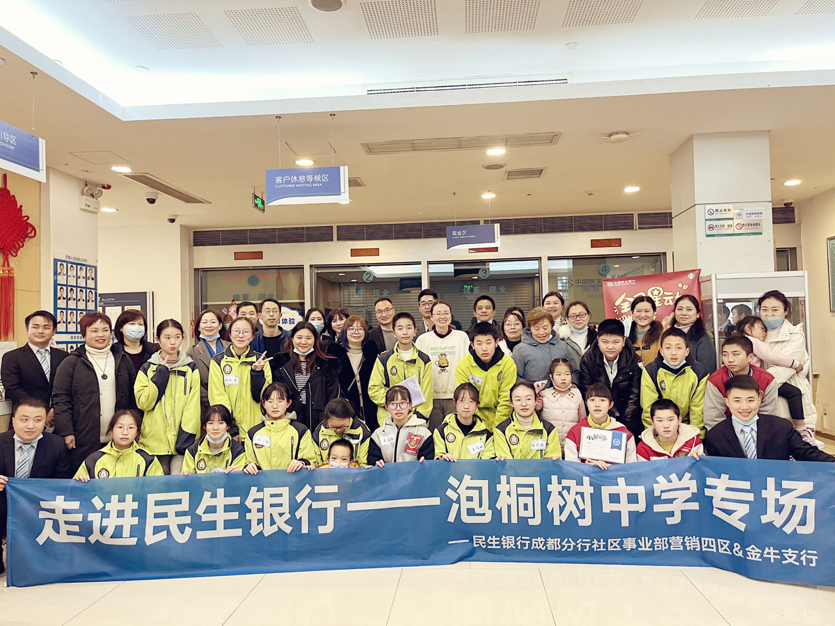 根据中共中央、国务院印发的《中国教育现代化2035》,切实落实“双减”后在促进学生全面发展、个性发展的双向推动,中国民生银行成都分行在总行推出的“益起童行”品牌项下,联合成都泡桐树中学开发了职业体验课程,并于近日与泡桐树中学开展了“益起童行——我是银行家”职业考察活动。