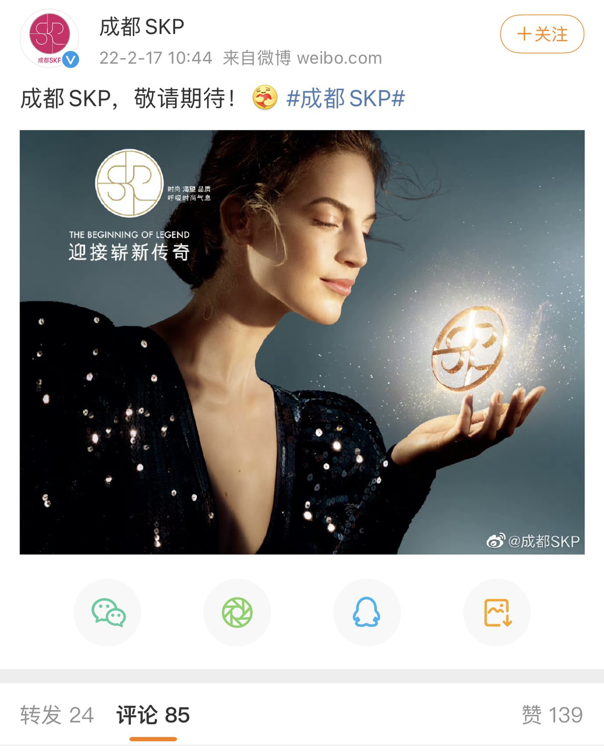 最新消息,成都SKP官方微博于2月17日发布首条内容:“成都SKP,敬请期待!”该条微博的配图海报上标有“迎接崭新传奇”六个大字。截至记者发稿时,该条微博共计有85条评论,139个赞,24次转发。