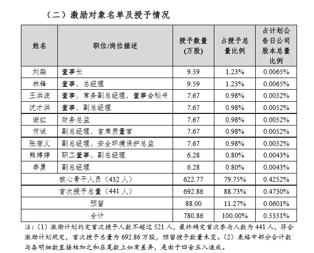 此次股权激励对象包括:董事、高级管理人员、中层管理人员及核心骨干人员。其中,泸州老窖董事长刘淼、总经理林锋分别授予的股份数量为9.59万股;王洪波、沈才洪、谢红等公司高管被授予股份数量为每人7.67万股,授予价格为92.71元/股。