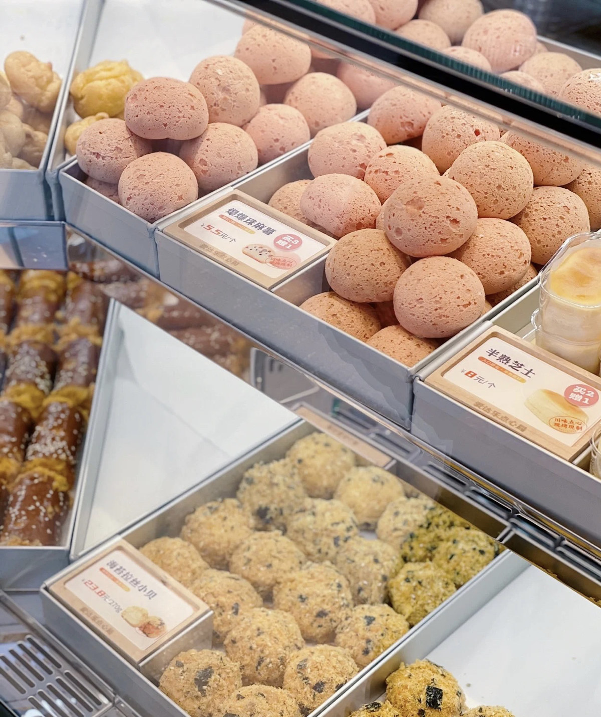 “我们的产品都是小份制糕点、独立小包装,适合早餐、下午茶、休闲等多元化的场景。外卖的比较多,海苔拉丝小贝、藤椒牛肉卷、芋泥麻薯小方是大家点击率比较高的产品。”爱达乐点心局吴店长介绍。四川在线在店内看到,除了桃酥、绿豆糕等典型的中国传统点心之外,新中式烘焙品牌推出更多中西合璧的创新型产品。比如,肉松小贝、各式麻薯、冰淇淋泡芙等等,也都是热门产品。