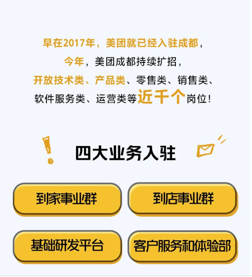 美团认为,成都作为国家中心城市、内陆经济高地,在国家发展战略中具有独特地位,具备蓬勃的创新活力和强大的人才吸引力。自2017年起,美团到家事业群、到店事业群技术团队相继落户成都,搭建起美团成都的雏形。如今,已经有越来越多核心业务、研发团队入驻成都。