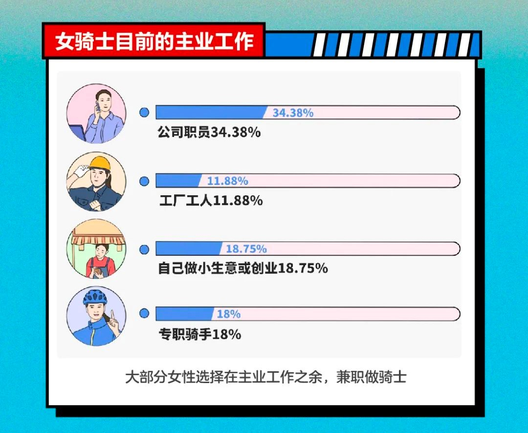 报告显示,目前女骑士群体中,专职骑士的占比为18%,而对于兼职的女骑士而言,主业工作为公司职员的占比达34.38%,自己做小生意或创业的占比为18.75%,工厂工人占比为11.88%。