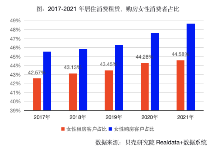 “她需求”的持续走强,让女性消费者的占比连续5年在租、购市场都呈上升趋势。贝壳研究院《报告》数据显示,全国38个样本城市,女性购房客户平均占比从2017年45.54%上升到2021年48.65%,女性租房客户平均占比从2017年的42.57%上升到2021年的44.58%。其中,成都女性购房者表现较为显眼,女性客户占比增长较快,2021年租房占比约44%,购房占比约48%。