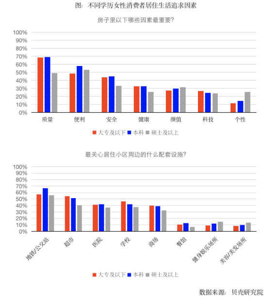 从细分群体来看,女性消费者居住消费需求多元,在年龄、学历、收入等维度上表现出一定的关注重心差异。以高学历女性消费者为例,这一群体的居住需求层次相对较高,学历越高的女性消费者表现出越强烈的“悦己”特点,如关注房子颜值、个性等因素。