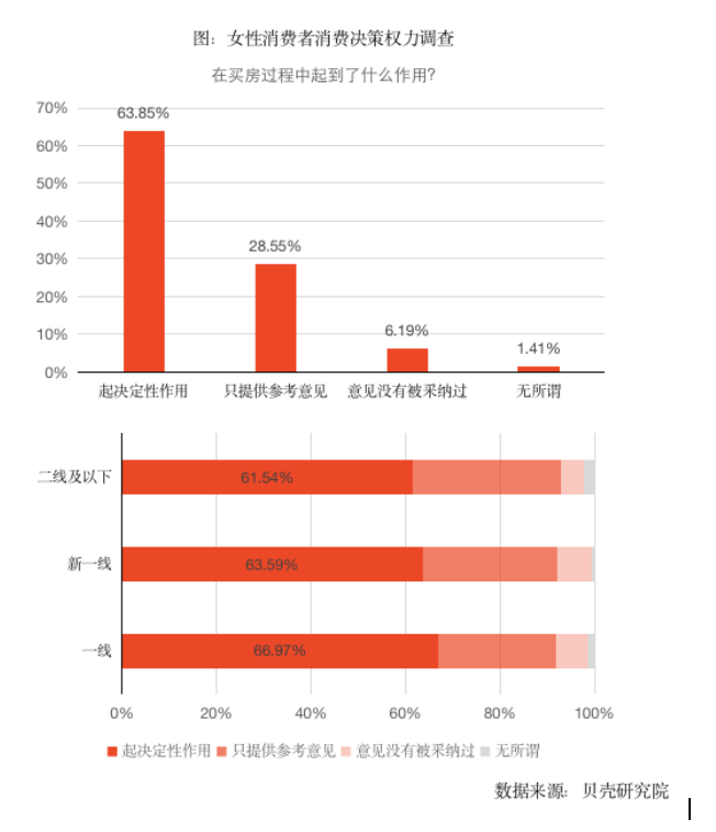 贝壳研究院调查显示,在有房群体中,有超过6成的女性表示自己在买房过程中起决定性作用,仅有6.19%的受访女性表示自己的意见没有被采纳。在成都,女性在买房中起决定作用的占比越高,女性独立性带动购买决策权提升。