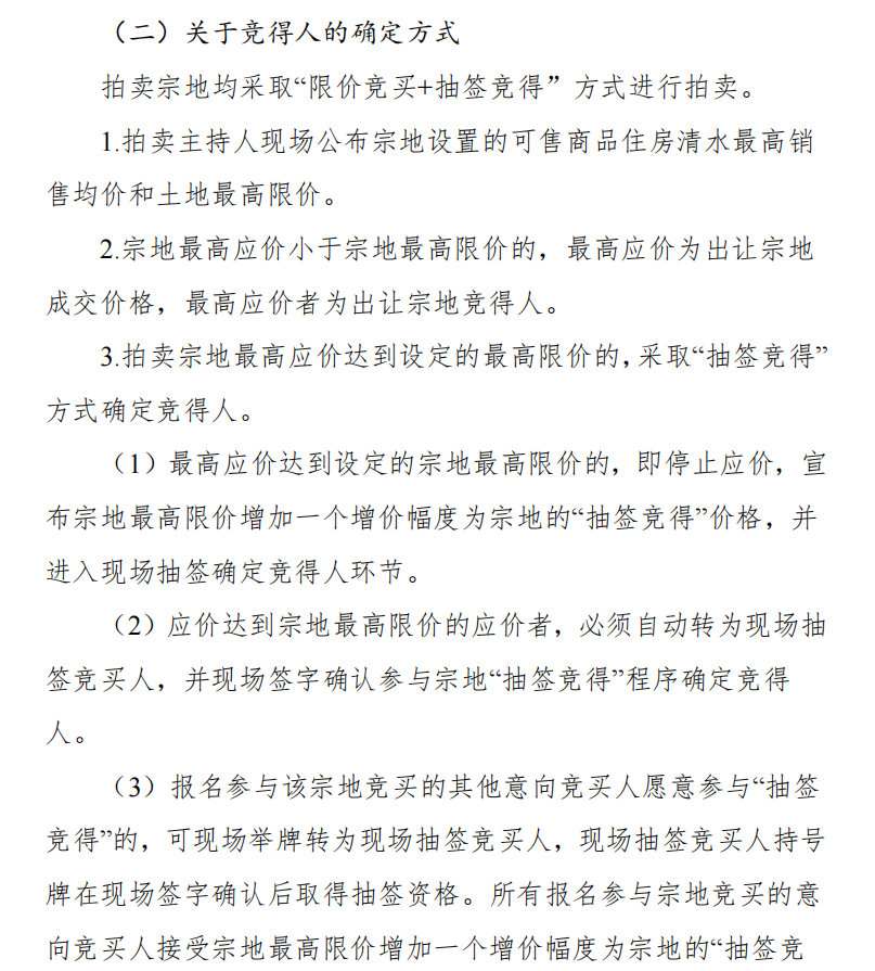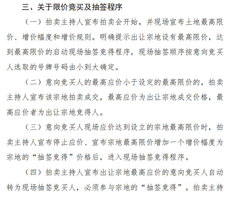 3月9日,50宗土地出让文件正式上传,根据出让文件显示,此次集中供地现场土拍规则有所调整,从去年第三批次的达到土地最高限价后续竞销售型人才公寓面积比例调整为“限价竞买+抽签竞得”,拍卖宗地最高应价小于宗地最高限价的,最高应价者为出让宗地竞得人。拍卖宗地最高应价达到设定的最高限价的,采取“抽签竞得”方式确定竞得人。