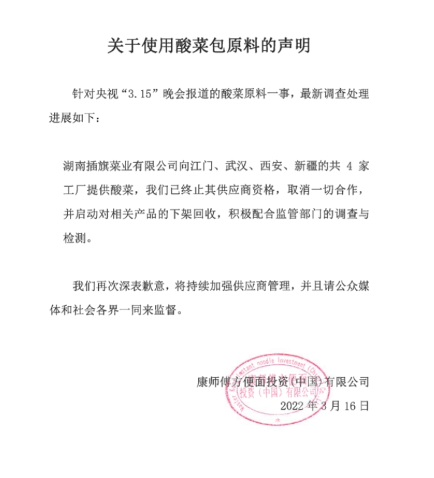 针对“3·15”晚会曝光的湖南插旗菜业“土坑酸菜”食品安全问题,16日凌晨,康师傅方便面投资(中国)有限公司发布声明称:湖南插旗菜业有限公司是我司酸菜供应商之一,已立即中止其供应商资格,取消一切合作,封存其酸菜包产品,积极配合监管部门调查和检测。同时声明称,此次事件辜负了消费者信任,深表歉意并将引以为戒!