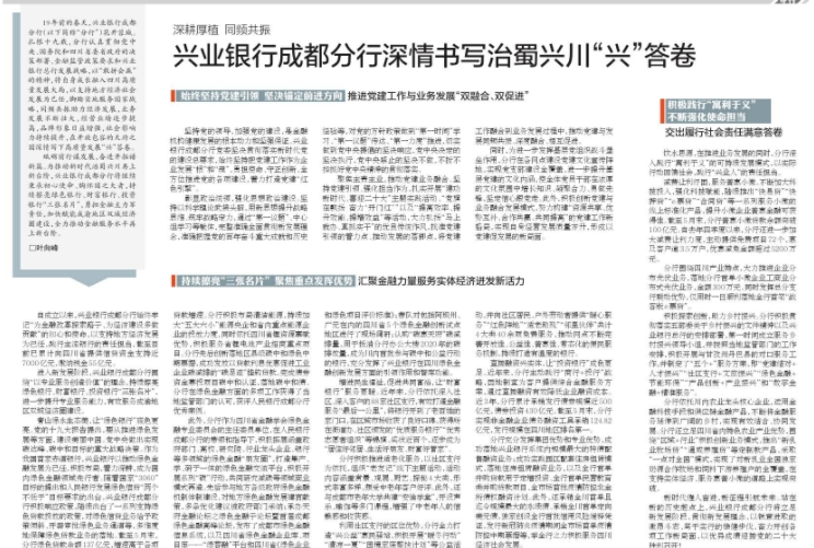 砥砺前行谋发展,奋进开拓谱新篇。为推动新时代治蜀兴川再上新台阶,兴业银行成都分行将继续秉承初心使命、胸怀国之大者,持续擦亮绿色银行、财富银行、投资银行“三张名片”,勇担金融主力军责任,加快赋能成渝地区双城经济圈建设,全力推动金融服务水平再上新台阶。