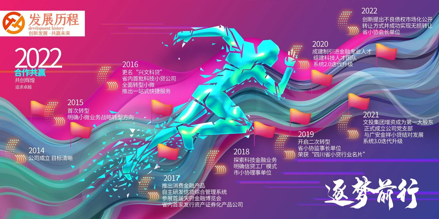 2017年:推出消费金融产品;自主研发信贷综合管理系统成功上线;受邀参展首届“天府金融博览会”;成为全省首家成功发行资产证券化产品的小贷公司。