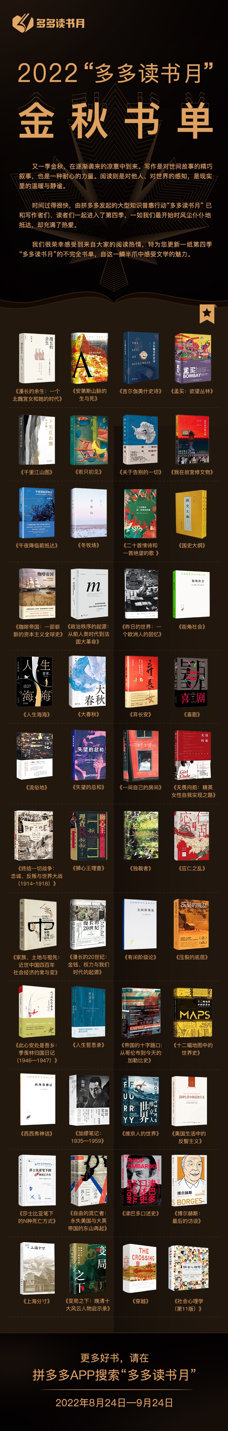 成立一年多来,“多多读书月”项目组致力于优化消费者体验,进行了数次产品升级,第四季读书月继续在前三季产品基础上迭代创新,以亿元读书基金增大官方补贴力度,扩大优质书目补贴范围,补贴更多的正版经典优质书籍,联合更多的国内权威出版社、图书出版公司和优质图书品牌。8月24日至9月24日,在拼多多APP搜索“多多读书月”,进入专场活动页面,即可抢购平价正版经典好书。