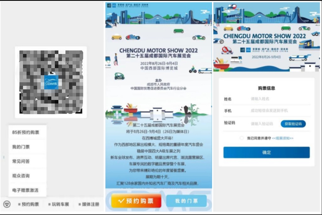 1、微信搜索关注“成都国际汽车展览会”,点击菜单栏“购票”链接快速购买门票!购票成功后自动获取电子门票二维码。