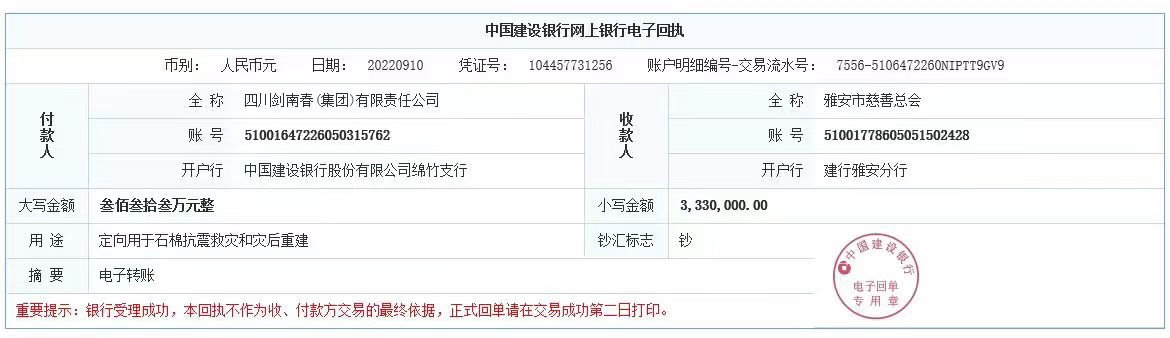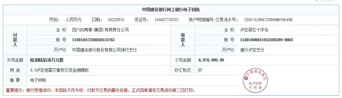 据介绍,本次总金额1000万元的捐款分为两笔,其中向泸定县红十字会捐款670万元,向雅安市慈善总会捐款330万元,目前两笔善款均已汇出。