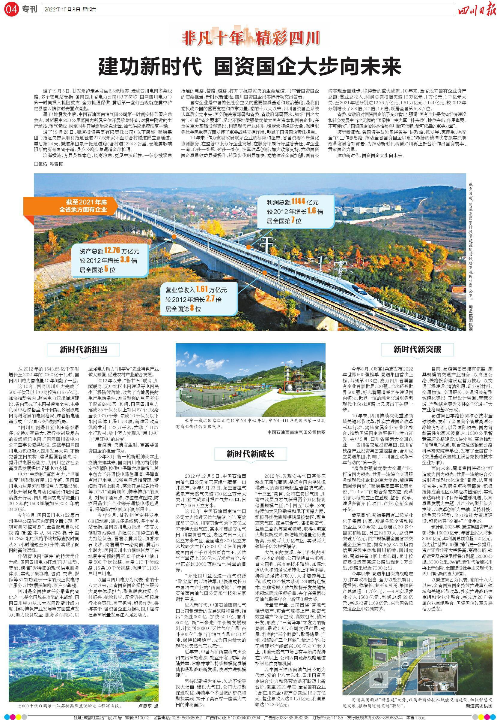 以中国石油西南油气田公司为代表,党的十八大以来,四川国资国企综合实力和经营效益不断迈上新台阶。截至2021年底,全省国有企业(含在川央企)资产总额达16.2万亿元、营业总收入达3.1万亿元、利润总额达1742.6亿元。