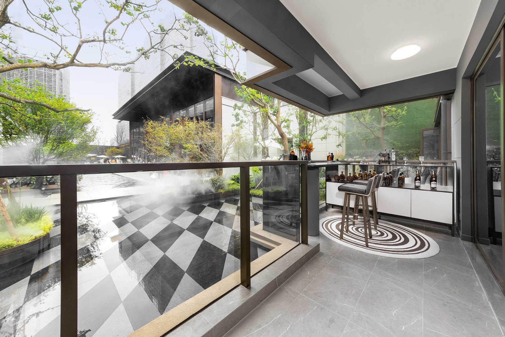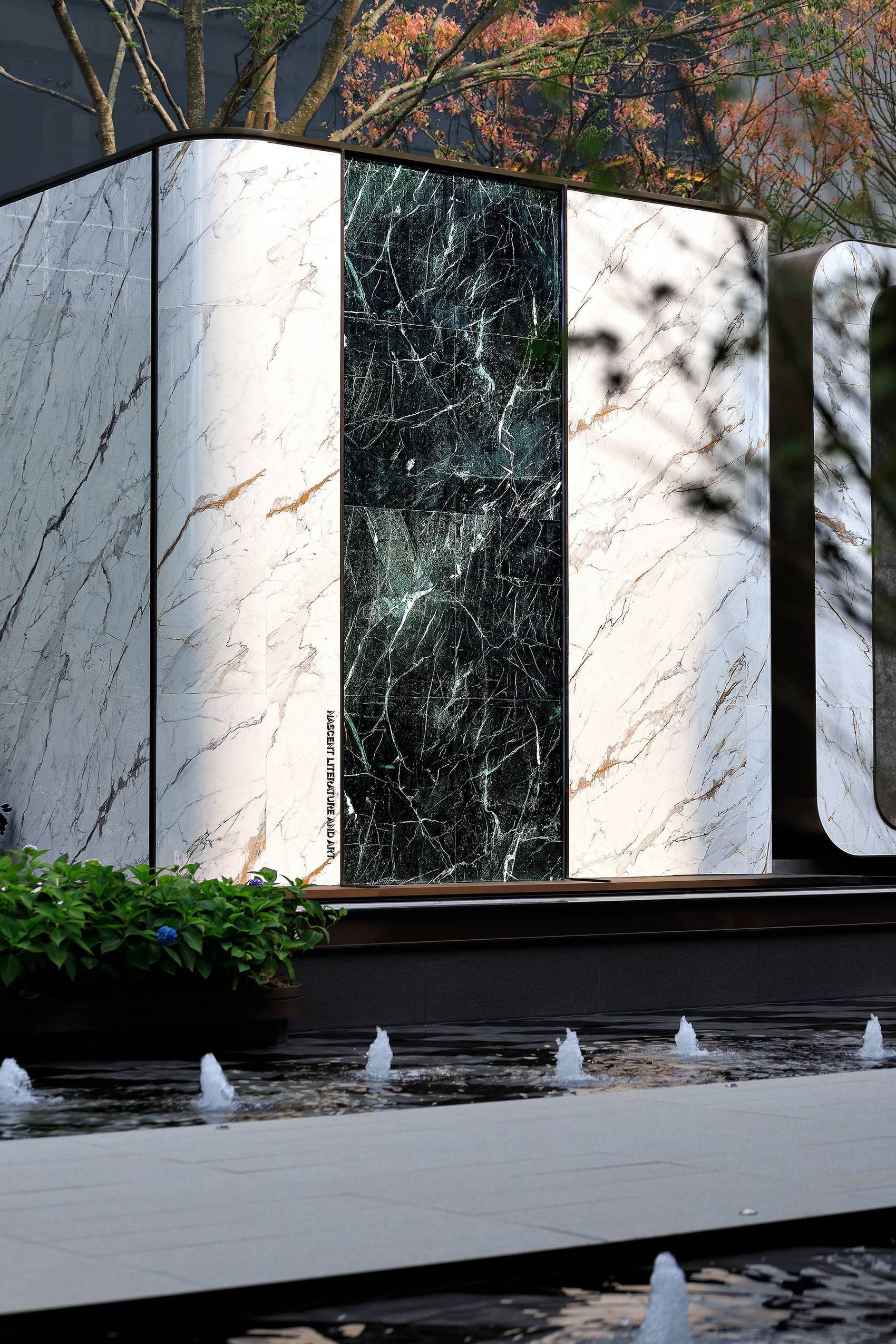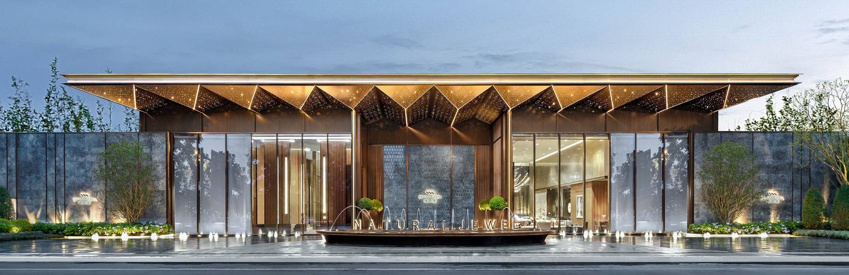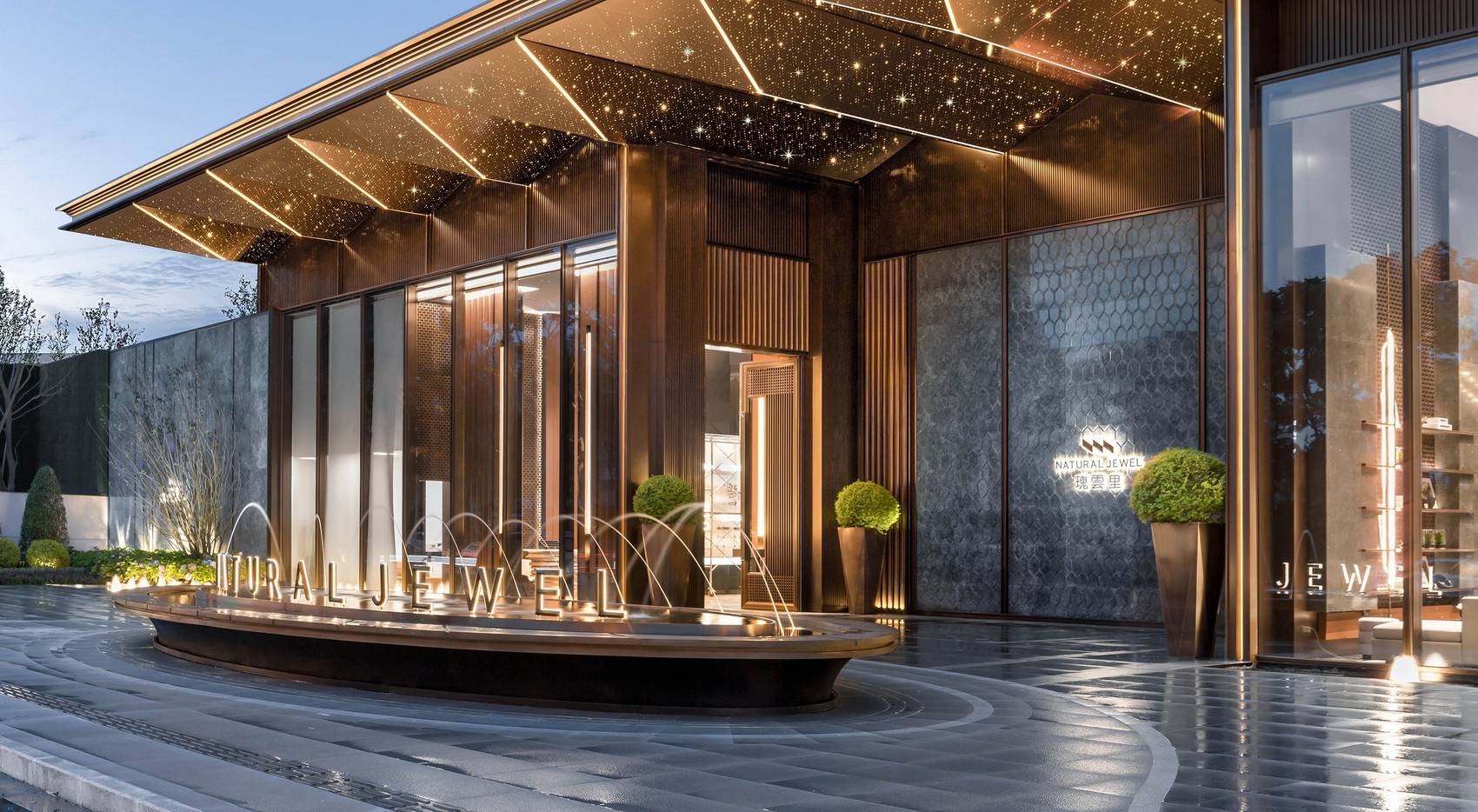 经过瑰雲里项目所在的金樽三街,一个熠熠生辉的星空顶大门瞬间吸引所有目光,它就是瑰雲里项目售楼部的大门,也是未来小区的主入口。整个大门宽度约55米,星空顶的灯带装饰加上线形格栅的设计,极具格调。进入大门踏进瑰雲里的实景示范区,便能看见度假式园林,高低错落的绿植打造出赏心悦目的品质园区,叠水景观搭配“普拉达绿”的石材景墙,仿佛置身轻奢度假酒店。