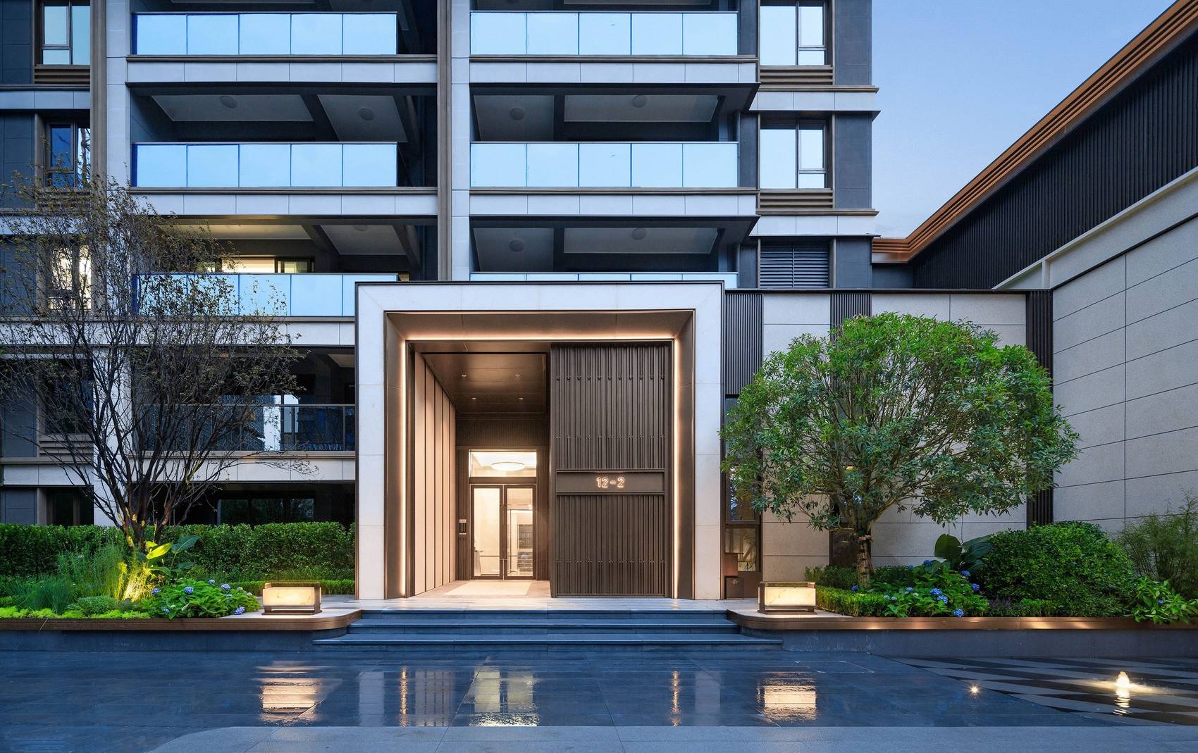 抬眼望便可看见的极简现代立面,采用具有现代风格的L型“天之翼”立面线条,阳台挑檐都统一采用了香槟色的铝合金线条,打造富有肌理质感的外观。大面积使用玻璃栏板重视采光和通风性能的建筑面宽,营造通透的居住观感。