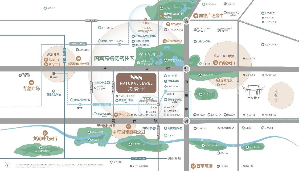 除了文脉厚重,在交通、教育和商圈配套上,国宾板块主城优势明显,快速通道、地铁线路纵横,还有在建中的兴盛TOD和金周路TOD。教育方面拥有涵盖从幼儿园、小学到中学全龄段公私名校资源。周边中海国际商圈、茶店子商圈等成熟商圈环伺,购物逛街办公一站即达。