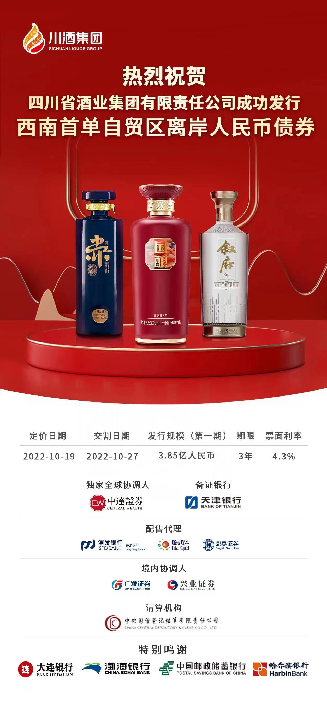 近期,在国家、省、市相关单位及金融机构对实体经济的大力支持下,四川省酒业集团有限责任公司(以下简称“川酒集团”)获得国家发改委境外债批复1.7亿美元等值额度。10月27日,川酒集团成功发行西南首单自贸区离岸人民币债券,首期发行金额3.85亿元,票面利率4.3%,期限3年。本次发行由天津银行提供备证增信,得到了大连银行、渤海银行、中国邮储银行、兴业银行、哈尔滨银行、上海银行等众多金融机构的关注和支持。