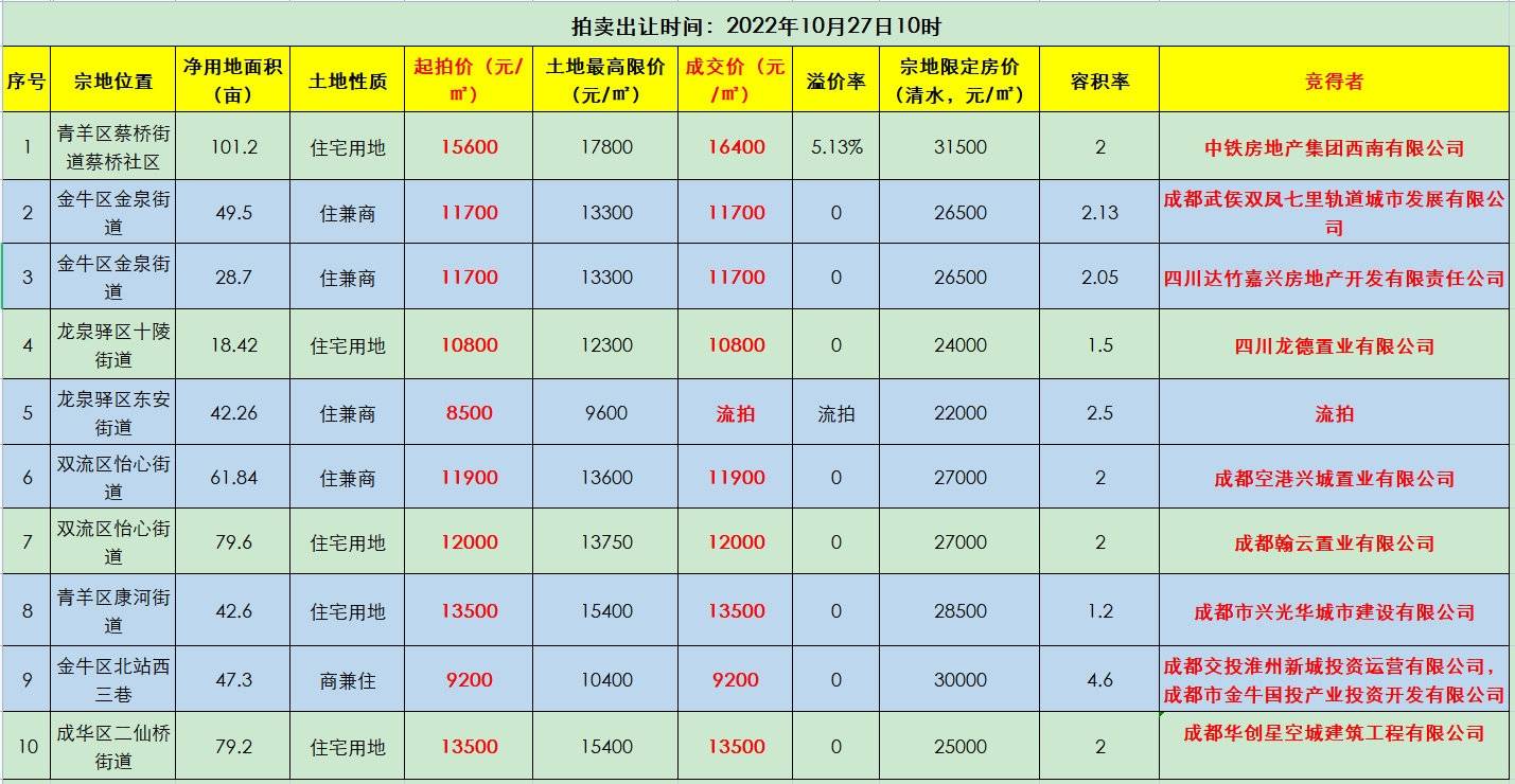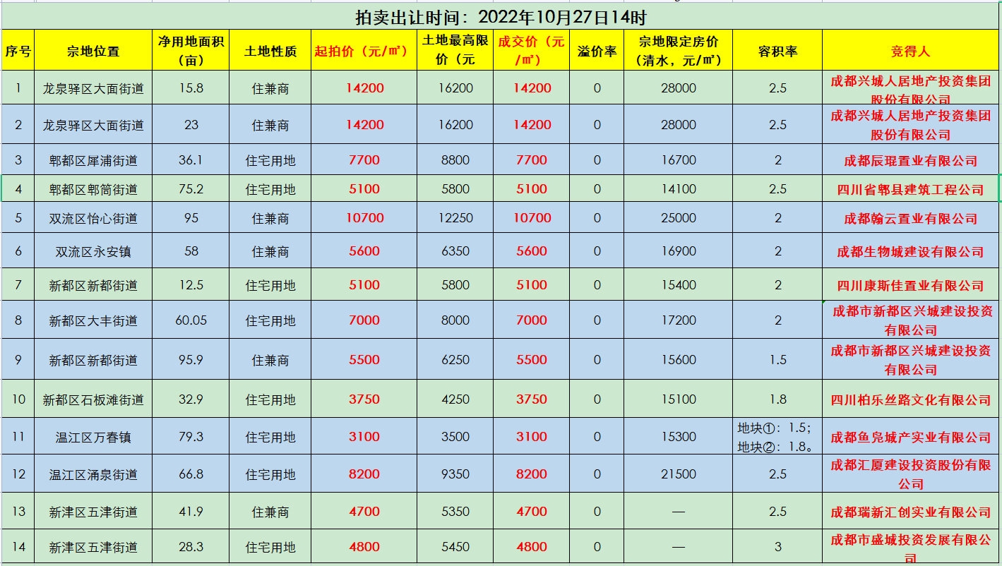 2022年成都第三次集中供地开拍 | 首日3宗地块流拍,超八成土地底价成交