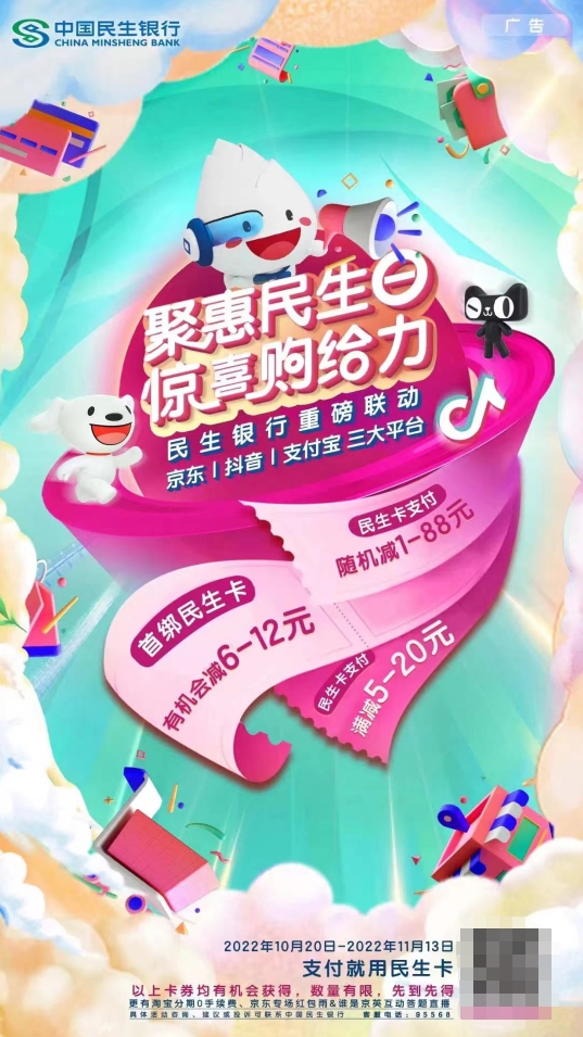 10月20日-11月13日,民生银行携手京东、支付宝、抖音等平台,联合打造“聚惠民生日”“双十一”专场优惠活动。