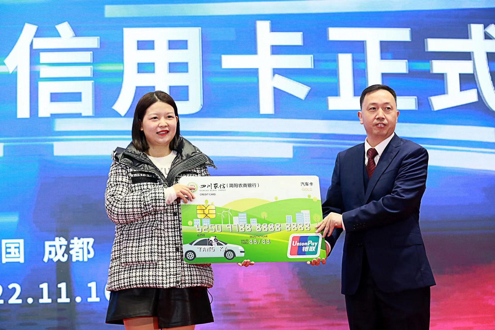 会上,在各界人士的见证下,四川农信向客户代表授发了全省首张汽车信用卡。