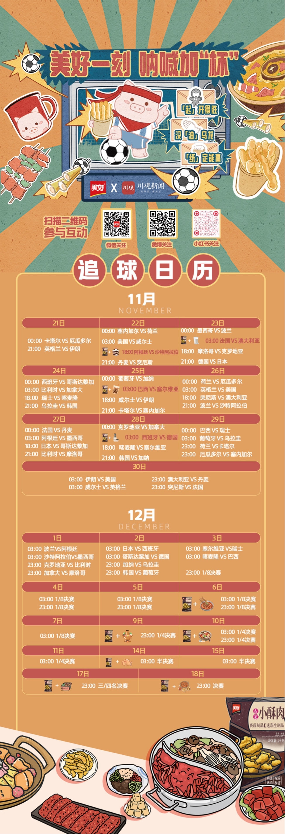 32支球队,64场赛事,2022卡塔尔世界杯开赛之际,美好食品邀请川籍明星球员姚夏,定制美食福利版“观球日历”。未来近一个月的时间,美好食品将与球迷们共同享受这场足球盛宴。值得一提的是,此次世界杯期间,美好食品联合了成都十家餐饮品牌,通过其官方微博、微信、小红书等社交媒体平台,在世界杯期间为球迷们送上福利。小酥肉、火锅、串串等美味外卖到家,尽享宅家看球也有美食相伴。