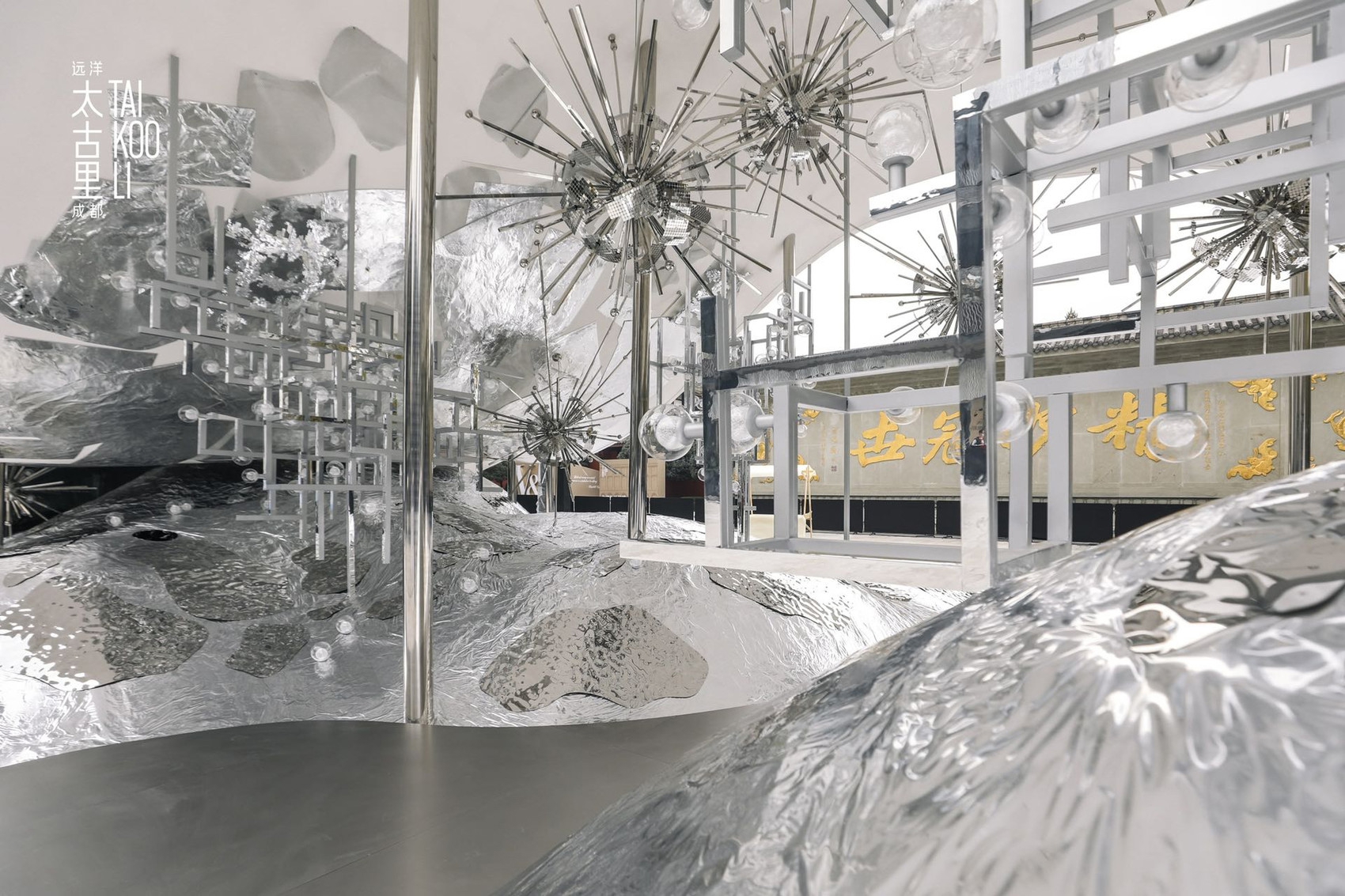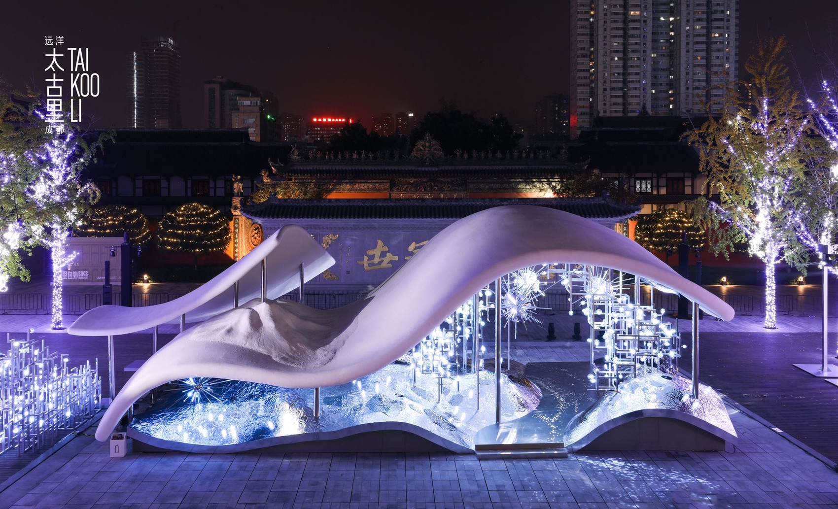 成都远洋太古里以“雪”为灵感,构建出仿若有皑皑积雪的景观建筑,并通过艺术手法,用灯光呈现颇具空间感的“降雪”氛围,营造出动静结合的奇幻空间。白天,大片“雪衣”下各色的晶体会伴着阳光反射出丰富的色彩和闪耀的光影,再伴以冬日缥缈的烟雾,令人仿佛置身于真实流动的雪雾之中;当夜幕降临,上千灯盏随之苏醒,火树银花中仿佛冬雪正缓缓落下,如织就大片雪衣正温情地拥抱着这座城市,好似涌动着无限生机和对新年的祝愿。