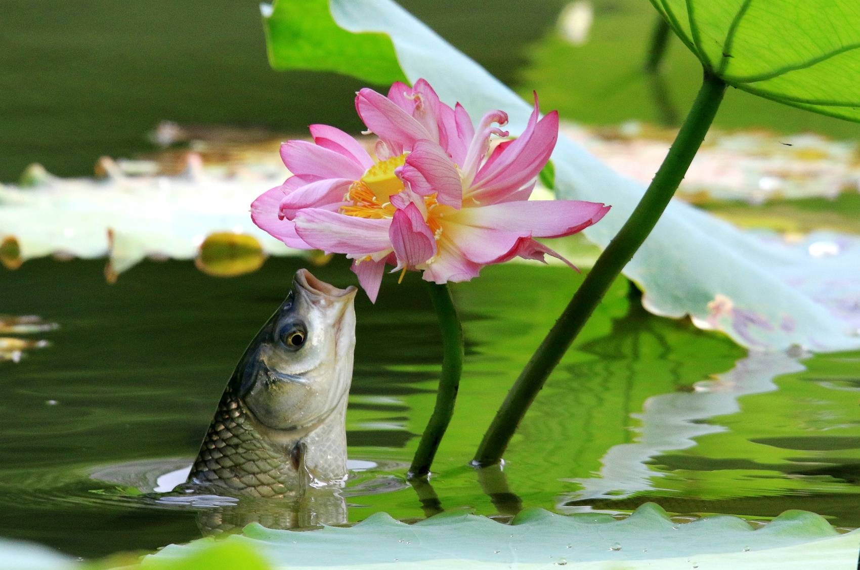 成都工业学院郫都校区九洲湖鱼吃荷花