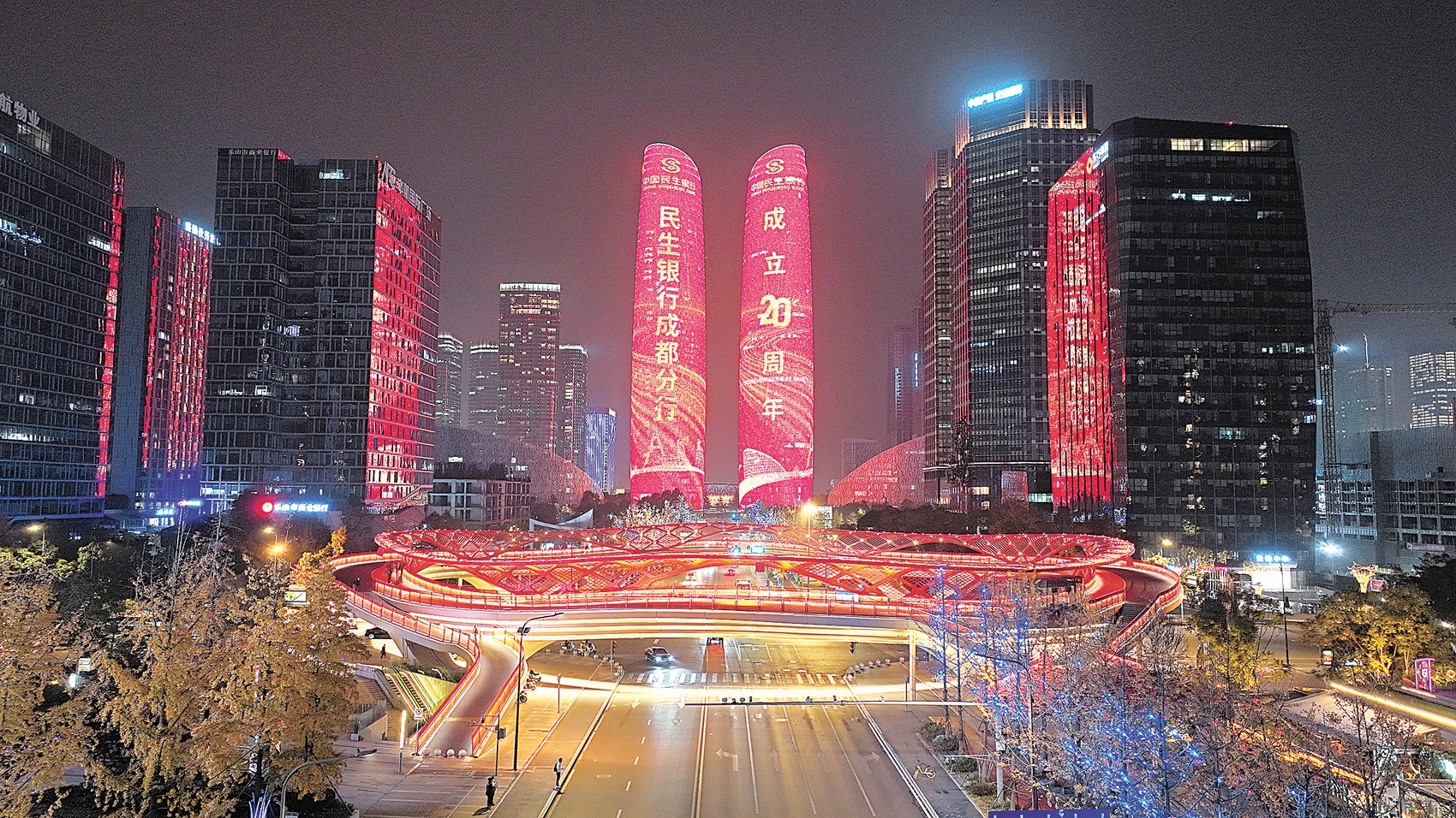 成都金融城双子塔为中国民生银行成都分行成立20周年点亮。