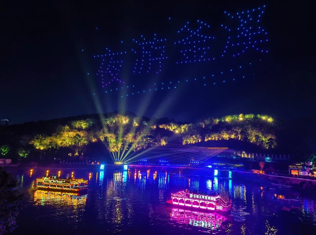天色渐晚,华灯初上。乘着晚风,我们登上了夜游釜溪的邮轮。半城青山半城楼,彩灯辉映碧水流。盐都历史两千载,一河读懂一座城。白天的釜溪河在阳光的照耀下如同一条闪烁的银线,自西向东缓缓流淌。夕阳西下,夜晚的釜溪河别有一番韵味。釜溪河,又称“盐井河”,是盐都自贡的母亲河。她是通往川、滇、黔、湘、鄂等省的主要运盐通道,见证了千年盐都的兴盛和繁荣。美丽的釜溪河承载着自贡悠久的历史和深厚的文化底蕴。夜游釜溪河项目结合现代声光电技术,将“千年盐都”“恐龙之乡”“中国灯城”这自贡三大城市名片尽数展现在大家眼前。上百架无人机在空中点亮,如同点点繁星遥挂夜空。水中飞人,技巧高超。铁水腾空,火树银花。来自五组跨国家庭的小朋友们无不被这绚丽的奇景吸引。真是景在河中走,人在景中游。