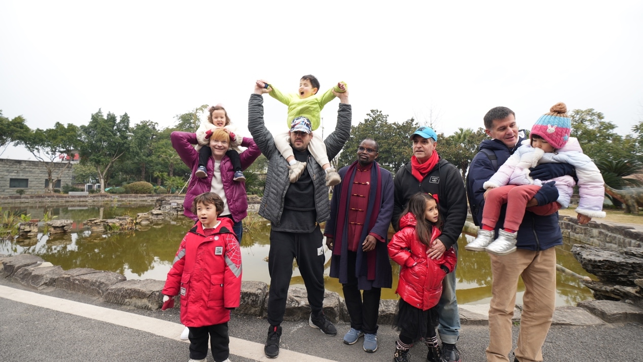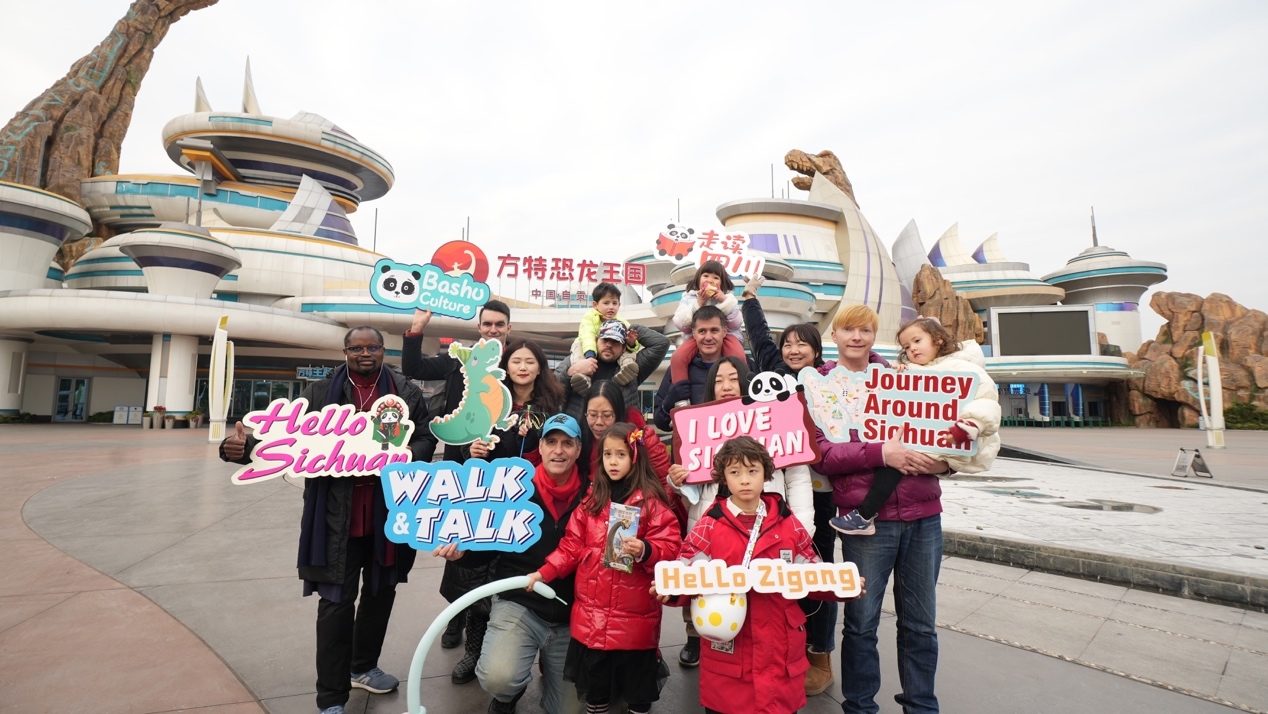 朝阳初升,“走读四川”再出发。“快看!是恐龙!”透过汽车玻璃窗,小朋友们大大的眼睛里满是期待。终于来到了盼望已久的自贡恐龙博物馆,还没到入口他们就被几个栩栩如生的恐龙雕塑吸引住了。自贡恐龙博物馆是目前世界上收藏和展示侏罗纪恐龙化石最多的地方,是在 “大山铺恐龙化石群遗址”上就地兴建的一座大型遗址类自然博物馆。在“恐龙遗址”厅,大家能够近距离观看真实的恐龙遗址,感受来自远古的呼唤。2023年1月,“恐龙探秘馆”也正式向大家开放,以探秘的方式,运用现代展示手段,呈现珍稀的恐龙标本,揭示其不为人知的谜题。来自中国西班牙跨国家庭的罗拉坐在爸爸的肩上和恐龙雕塑来了一个亲密互动。“大家快来自贡恐龙博物馆看恐龙呀!”来自中美跨国家庭的魏洛易兴奋的叫到。