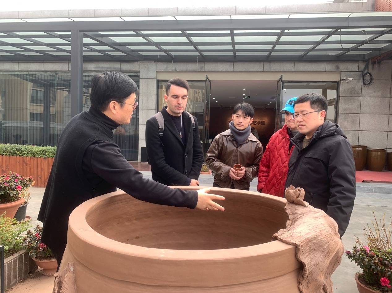 “走读四川”走进了具有千年制陶史的荣县,来到了中国西部陶都——荣县土陶创意园。外籍友人们一进入创意园就被匠心独运的土陶艺术品吸引住了眼球。国家级高级美术师、画家、陶瓷艺术家刘勇向我们介绍起了这些作品的制作过程。“我们使用的都是天然矿物颜料,因为只有矿物颜料才能经历高温,而且长时间保持鲜艳的色彩。”在工作室我们见到了正在上色的土陶作品,工作人员们正专心致志地将混有矿物颜料的陶泥填入事先雕刻好的陶坯里。经过良工巧匠的雕刻润色,陶罐上幻化出一只羽色素朴、体态飘逸的仙鹤。这些手艺精巧的匠人其实都是刘勇老师的徒弟,别看他们年纪不大,却已经从事陶艺创作五六年了。除此之外,荣县土陶创意园还集结了一大批各个领域的艺术家,将他们的作品与当地土陶做结合,衍生出许多精粹、臻美的艺术作品。当我们结束土陶之旅时,外籍友人们无一例外成了刘勇老师的粉丝。“我很高兴能够见到刘勇老师,参观到他精美的艺术作品,让我们体会到荣县土陶的独特魅力。”来自美国的马宏伟说道。