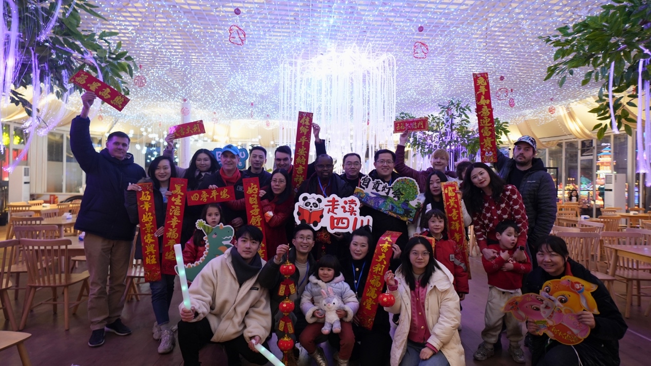 此次“走读四川”走进了中华彩灯大世界的万千璀璨之中。中华彩灯大世界坐落于自贡东部新城,是以自贡彩灯文化为主题的彩灯之城,以独特的彩灯文化、精巧的彩灯工艺、创新多元的交互体验,诠释自贡夜游王国的魅力。第29届自贡国际恐龙灯会以“梦想之光·千灯之城”为主题,在往届灯会基础上继续突破提升,用彩灯连接现实与元宇宙打造“千灯之城”。“千灯之城”分为“乐享年味、剑侠江湖、辉煌新时代、潮玩联盟、创想世界”5大主题区,以故事化、城市化的场景,荟萃了13个靓丽景点。高25米的“千灯之塔”展示了历届自贡灯会的“灯王”和来自五湖四海的彩灯样式。千灯万盏,集世界璀璨辉映大地,寓意千家万户的美好生活。除此之外,“千灯萌兔”也亮相自贡灯会。小朋友们见到萌萌的大兔子都争着要和它合影。在亲手制作过彩灯之后,再见到如此绚烂壮观的千灯之城,大家感触良多。来自马里的迪亚拉说到:“这是我第三次来自贡,每次来都有新的发现,自贡的灯会办得一年比一年好。”