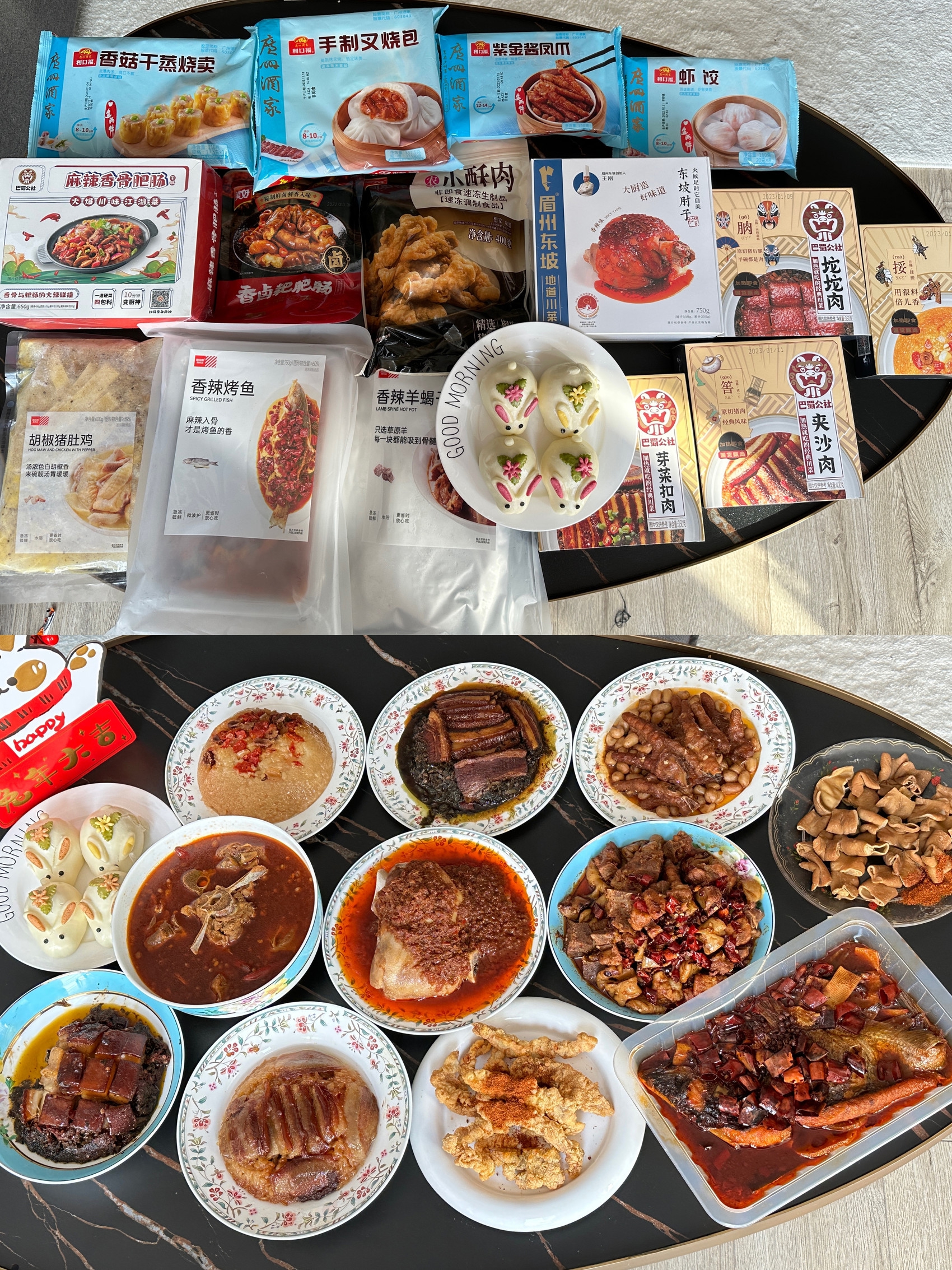 这是她第一次购买预制菜,作为厨房“小白”,简单方便的操作让她得心应手。不到30分钟,八菜一汤全部上桌,东坡肘子、香辣羊蝎子、小兔子造型的馍馍.....应景年味扑面而来。