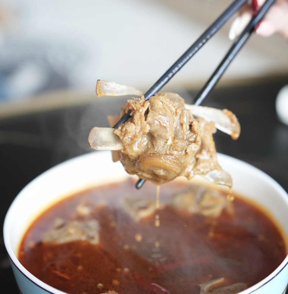 打开包装,在微波炉里加热4分钟,一碗芽菜扣肉已喷香扑鼻。平时没有两个小时吃不上的东坡肘子,当天她15分钟就做完了,连皮带肉吃进嘴里,香糯不腻耙而不烂。