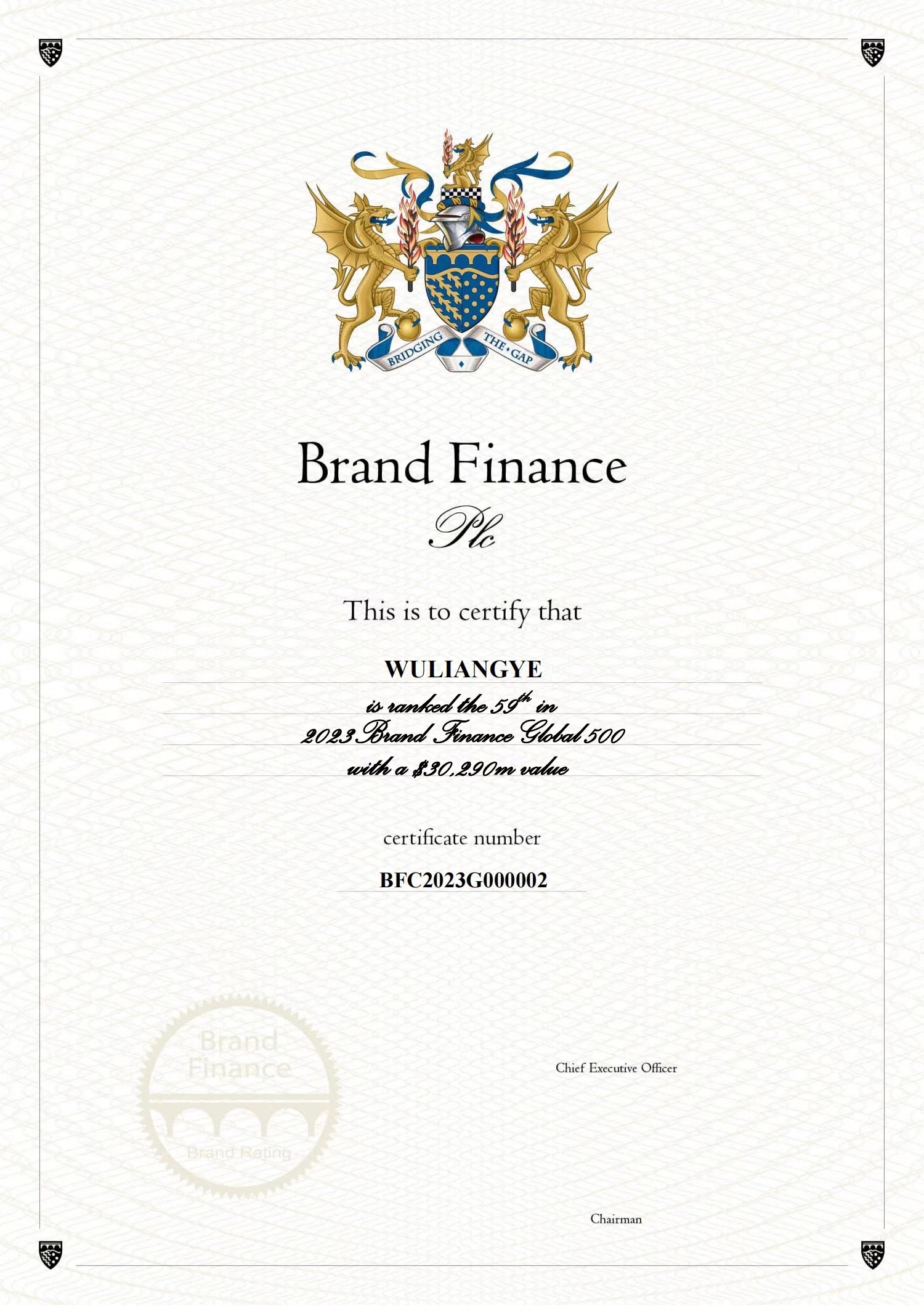 榜单显示,2023年五粮液的品牌价值为302.9亿美元,较去年增长了5.4%,在BrandFinance2023年“全球品牌价值500强”榜单中排名第59位——这是五粮液三年来持续保持品牌价值正增长。