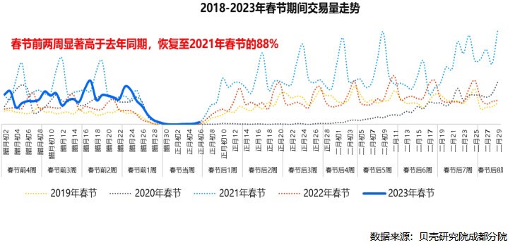 今年春节前后,成都的二手房市场也比较活跃。“通常节前都是淡季,但2023年兔年春节来临的前两周,成交量不降反增,周环比上升15%左右,带看活跃度也比去年同期提升了1.5倍,与2020年春节前30天相比交易量增长10%,与2022年春节前30天相比增长53%。”贝壳研究院成都分院表示。