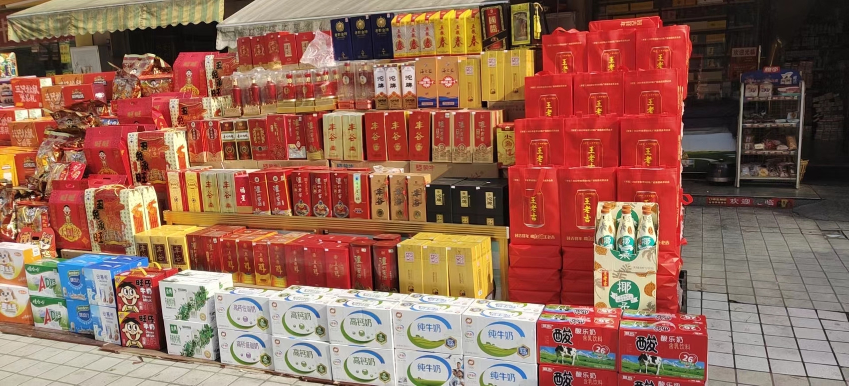 四川某县城春节期间烟酒店的促销外摆陈列