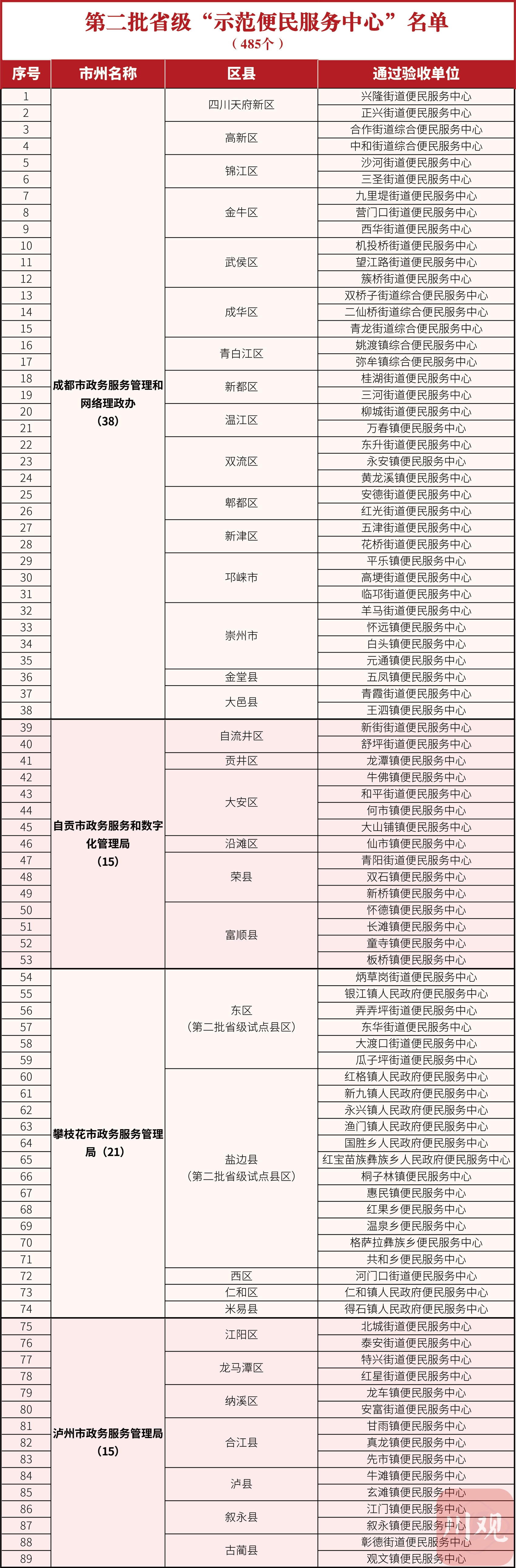 2月10日,记者从四川省政府政务服务和公共资源交易服务中心获悉,四川天府新区兴隆街道等485个便民服务中心被确认为第二批省级“示范便民服务中心”。截至目前,全省共有754个省级“示范便民服务中心”创建成功。