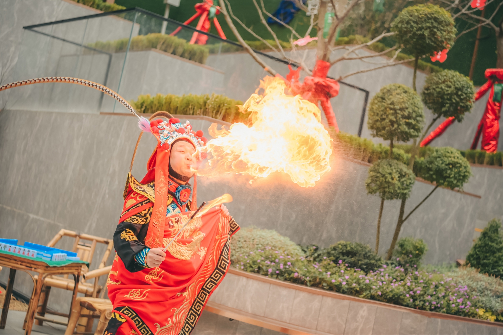 只听“噗”的一声,一团火焰从表演者的口中“喷出”,围坐在烤炉旁的观众热烈的鼓掌回应。2月18日,成华区首钢璟悦里一场“非遗专场”活动在项目售楼部举行,现场的观众们围炉煮茶,听着新派评书,看着变脸、吐火等川派绝活,趣味十足。