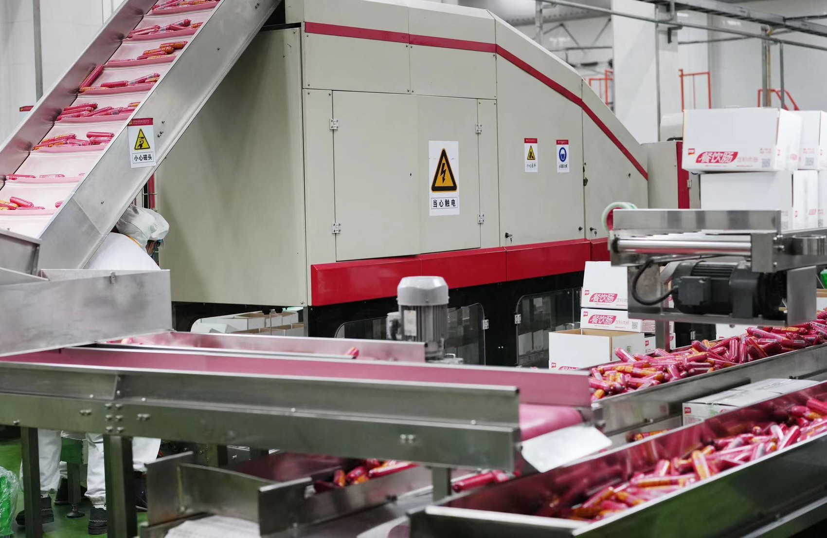 洗手、消毒、更衣......张建明换上白色的工作服和长筒靴,带上帽子和口罩,走进产品包装车间。“这台检测机器可以自动识别包装破损、重量不够的产品。”他一边介绍,一边麻利地取下传送带上被检测出重量不够的火腿肠。“产品能不能过关上市,得在我们的工厂里接受超规格考验。一根美好火腿肠从肉原料进场到制作完成要经过六大关卡。”