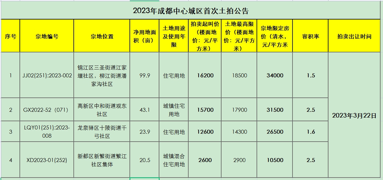 2月28日下午,成都市公共资源交易中心发布了今年成都中心城区首次土拍公告。公告显示,来自锦江区、高新区、龙泉驿区和新都区的共计4宗地将于3月22日拍卖出让,并依旧采取“限房价、定品质、竞地价”的拍卖措施。