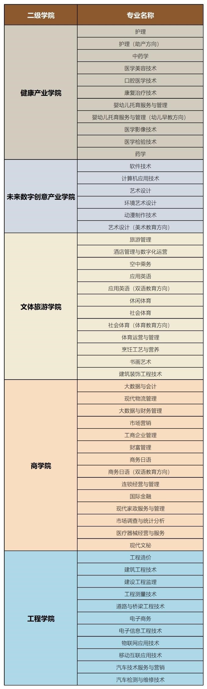 学校单招专业共46个,招生计划共9800名。有护理、医学美容技术、口腔医学技术、康复治疗技术、中药学、市场营销、社会体育等46个专业,主要涵盖电子与信息、医药卫生、旅游、财经商贸等9个专业大类。
