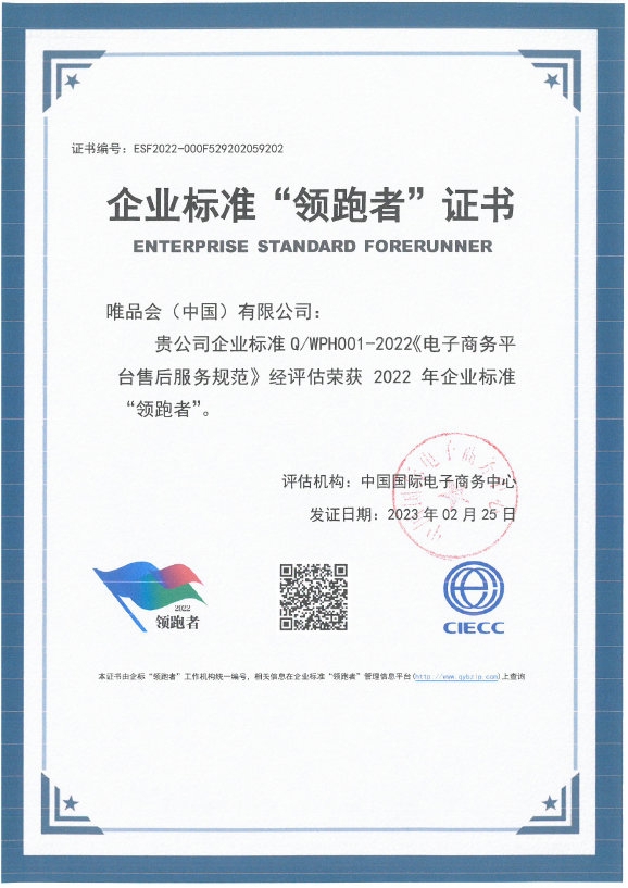 近日,中国标准化研究院在企业标准领跑者管理信息平台上公布了2022年度全国企业标准“领跑者”名单,电子商务首次被列入企业标准“领跑者”重点领域。其中,唯品会(中国)有限公司(以下简称“唯品会”)制订并实施的《电子商务平台售后服务规范》上榜,获得企业标准“领跑者”称号。