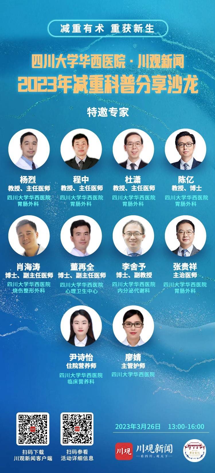 2023年3月26日,“减重有术 重获新生”四川大学华西医院 · 川观新闻——2023年减重科普分享沙龙将在成都举行。