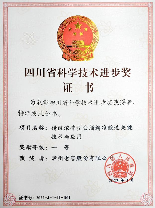 3月28日上午,四川省科学技术奖励大会暨第三届“四川杰出人才奖”颁奖仪式在成都市举行。在264个获奖项目中,由泸州老窖牵头,联合北京工商大学、四川轻化工大学、重庆大学和泸州智通自动化设备有限公司共同完成的“传统浓香型白酒精准酿造关键技术与应用”成果荣获2022年四川省科学技术进步奖一等奖,这也是所有获奖项目中唯一的白酒创新成果。