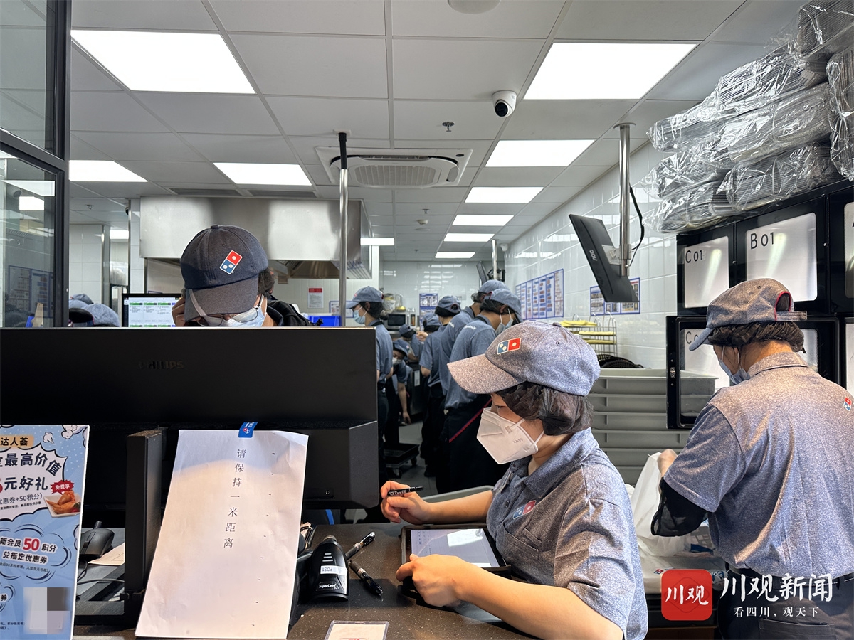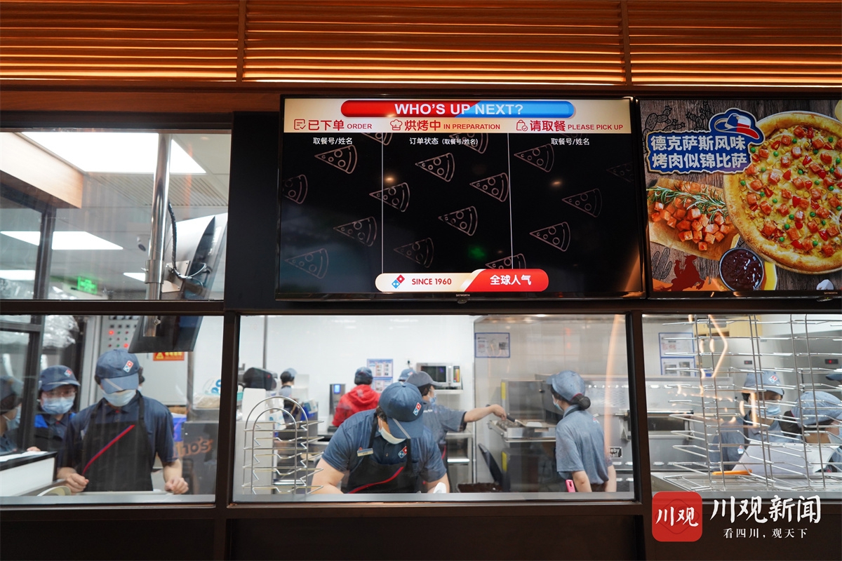 达美乐比萨成都首店——凯德广场·金牛店内工作人员正在紧张备餐。张艳 摄